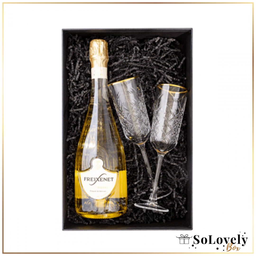 Un coffret cadeau exceptionnellement élégant, idéal pour les entreprises et les clients individuels qui apprécient le style et la qualité. L'alliance du vin mousseux espagnol Freixenet Royal avec deux flûtes cristall est une idée de cadeau de Noël parfaite, alliant classe et saveur.
